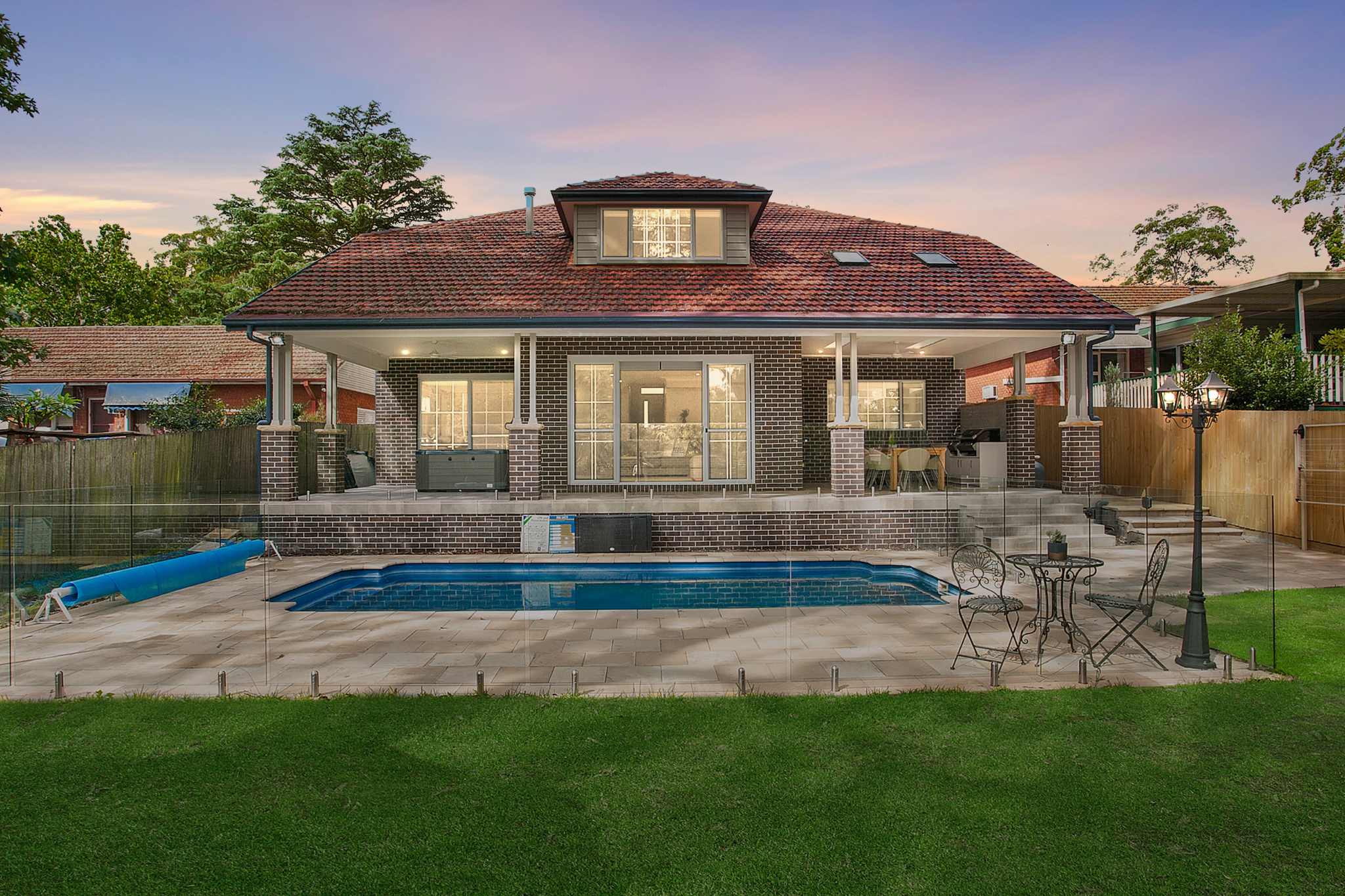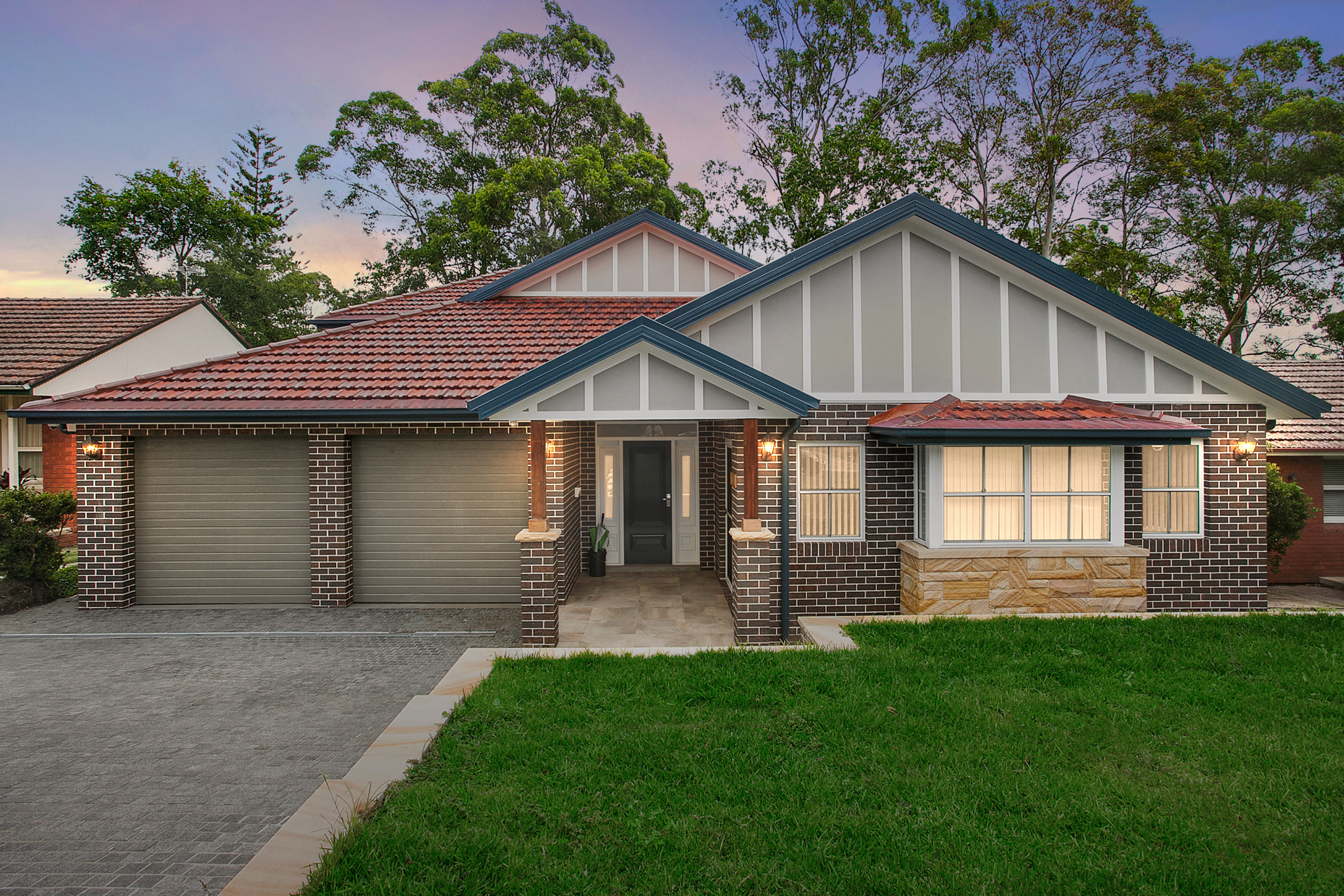 This interpretation of Australian Federation-style residence in Pennant Hills offers a sophisticated update of a beloved architectural style, now incorporating contemporary materials and details suitable for modern family living. Prominent gabled rooflines, a classic face-brick façade, and decorative gable infills pay homage to traditional Federation homes, while a streamlined colour palette, modern window proportions, and clean finishes ensure the design feels fresh and timeless rather than overly period-specific. Stone detailing at the base and a covered entry portico add warmth, texture, and a welcoming sense of arrival.