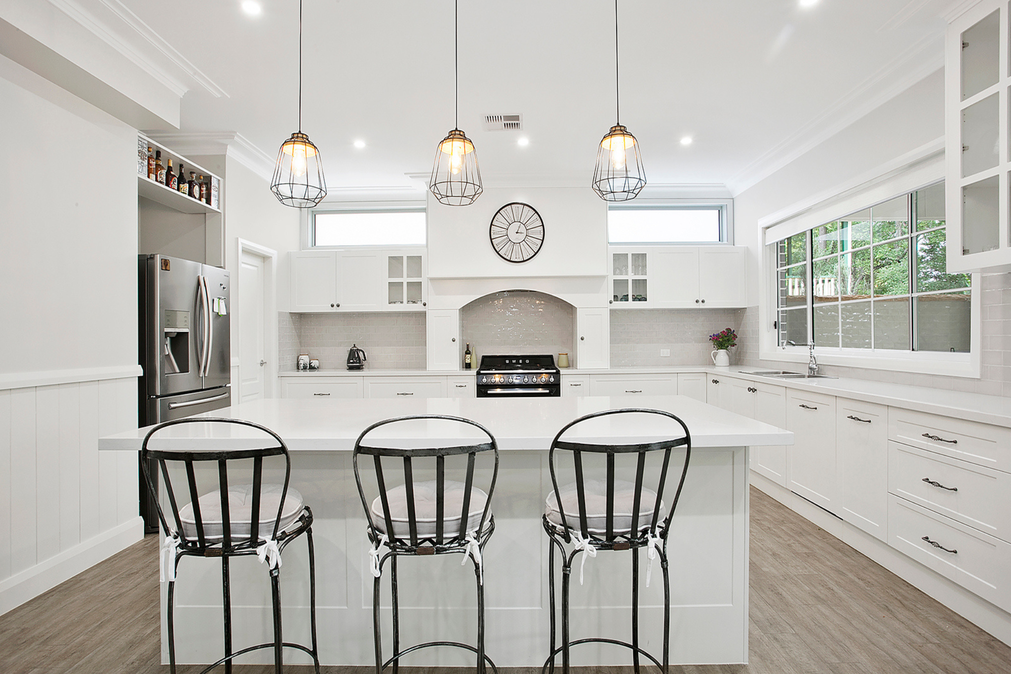 The country-style kitchen features 40mm stone benchtops, a generous island, Shaker-style polyurethane cabinetry, a freestanding SMEG oven, and a custom concealed rangehood, paired with durable timber-look floor tiles ideal for young families. Accommodation includes five spacious bedrooms, two full bathrooms, a powder room, and a separate laundry. An oversized executive office with its own kitchenette and powder room offers flexibility for working from home.