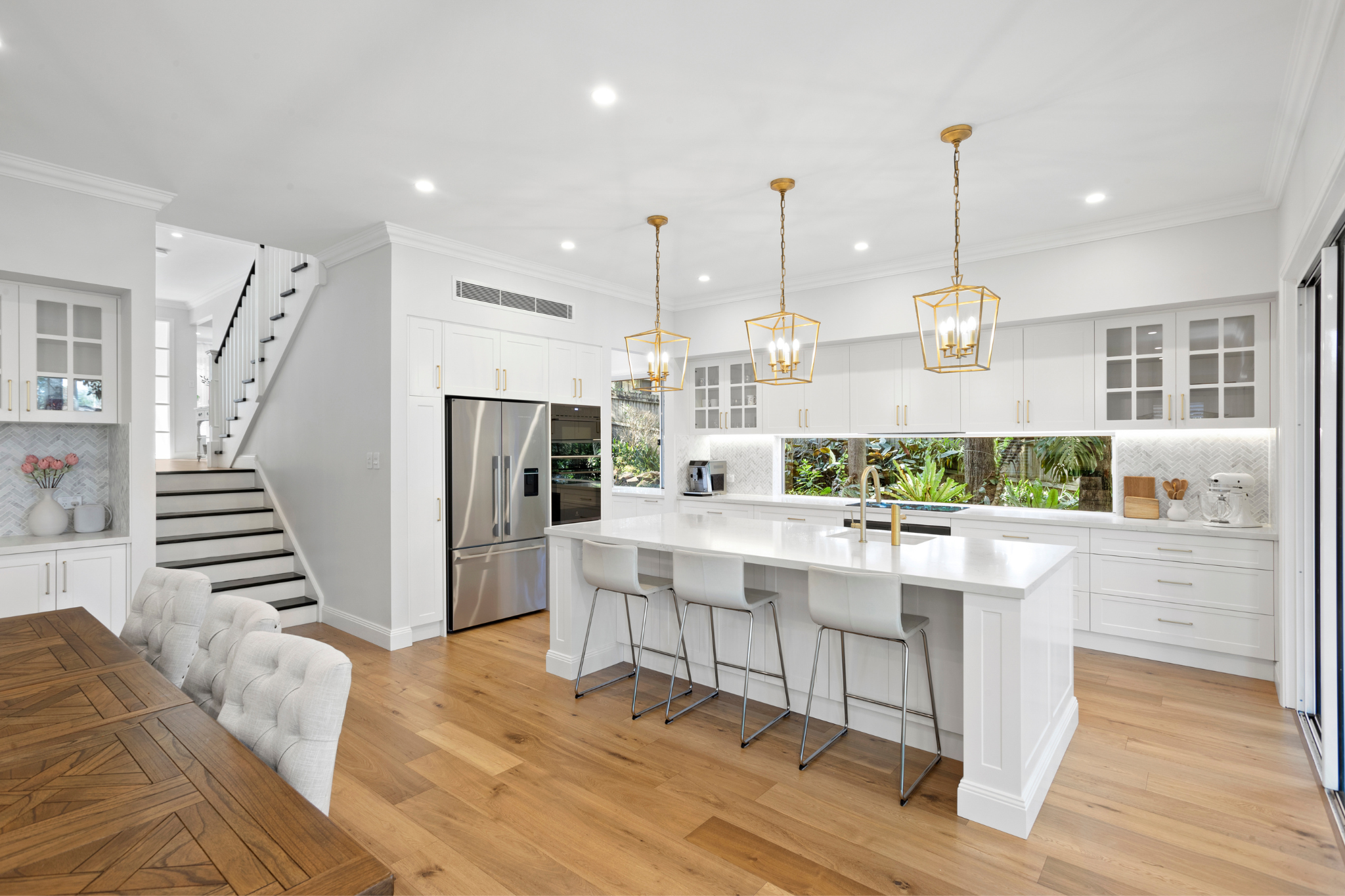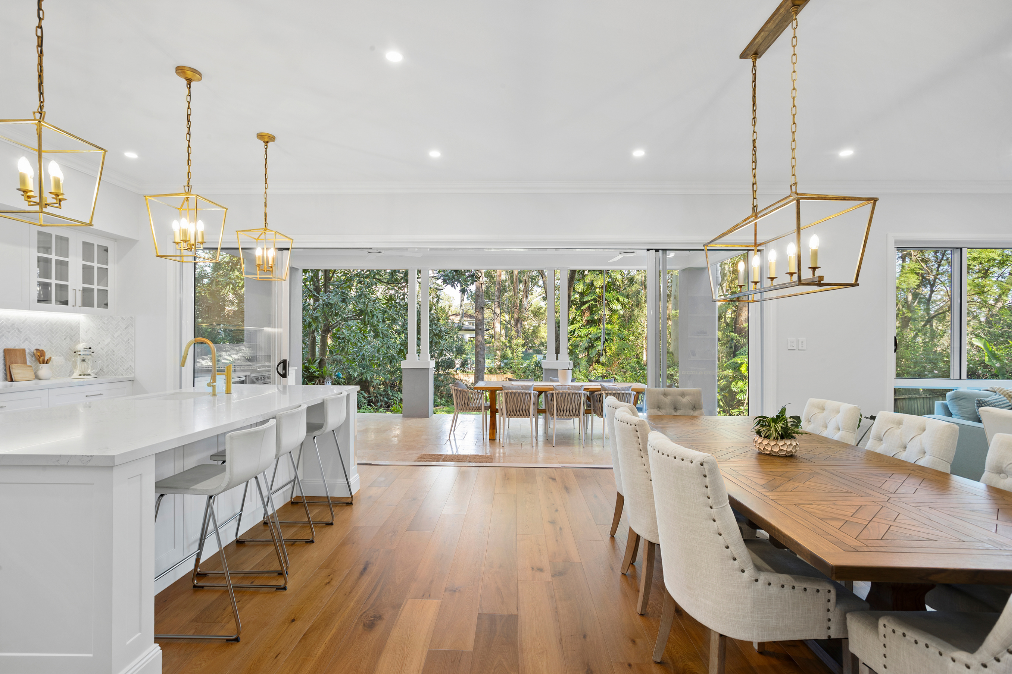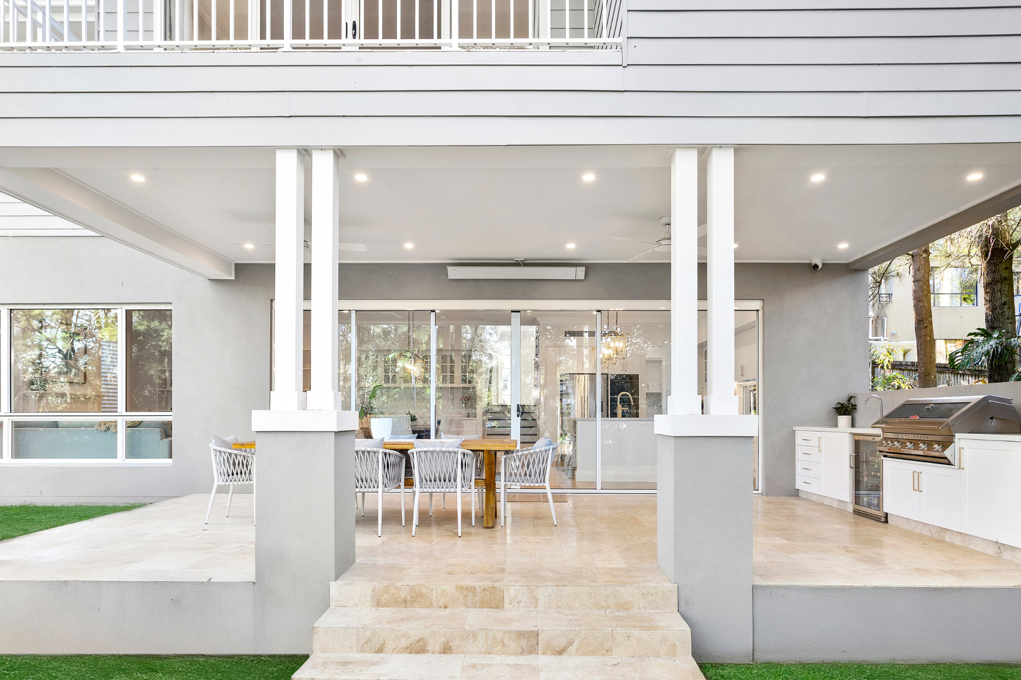 This five-bedroom, five-bathroom Coastal Hamptons residence in Wahroonga has been thoughtfully designed as a true forever home, blending relaxed coastal elegance with refined family living. At its heart lies a generous open-plan kitchen, living, and dining area, anchored by a traditional fireplace with a classic mantel and flowing seamlessly to an oversized alfresco finished with French-pattern tiling. A built-in bar and television unit sit parallel to the outdoor kitchen, creating a seamless entertaining experience.