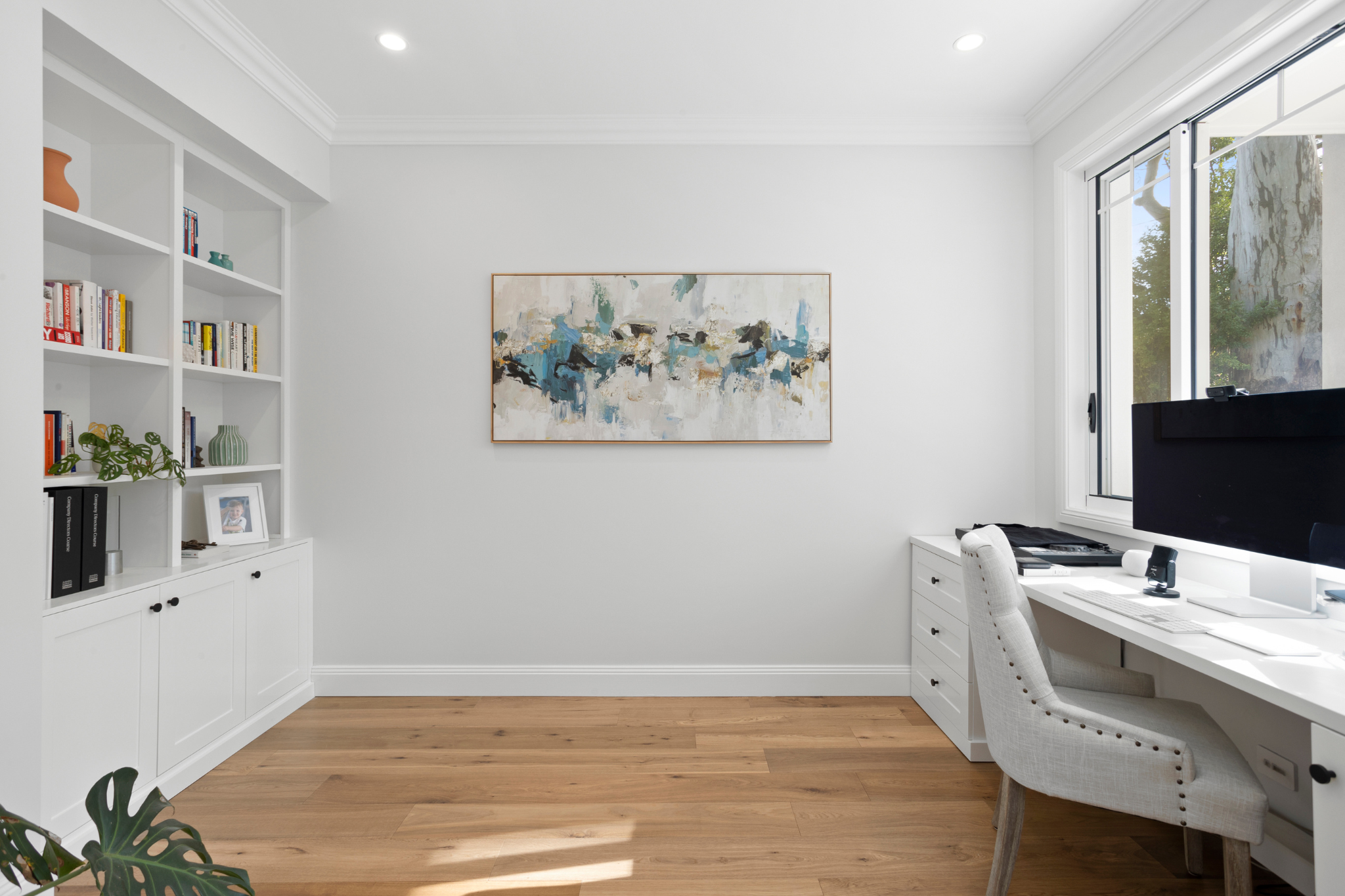Accommodation is luxuriously zoned. A ground-floor bedroom with ensuite offers flexibility for guests, while upstairs includes three generous bedroom suites, each with walk-in robes and ensuites, a spacious rumpus with a balcony, and an additional bedroom serviced by the family bathroom. The master suite is a standout, featuring a dressing area, walk-in robe, and a day spa-style ensuite with a freestanding bath, herringbone tiling, and dual showers. A beautifully balanced Coastal Hamptons home designed for generations to come.