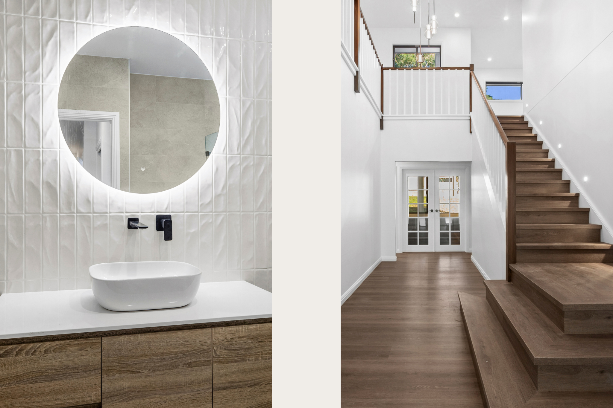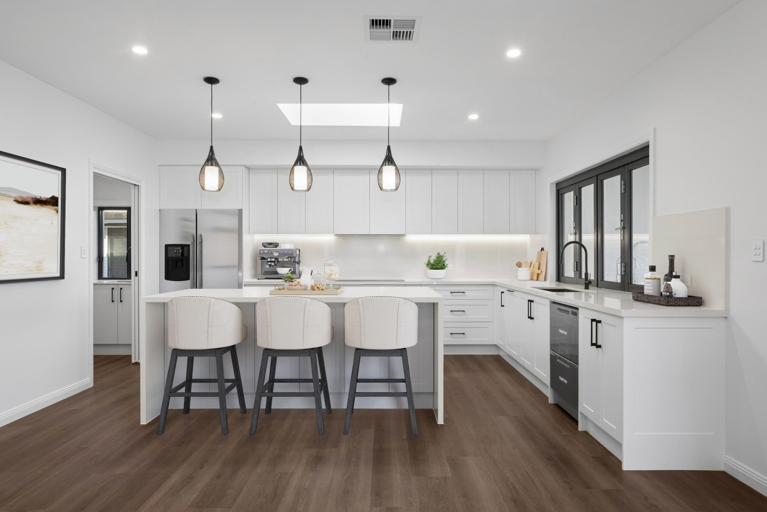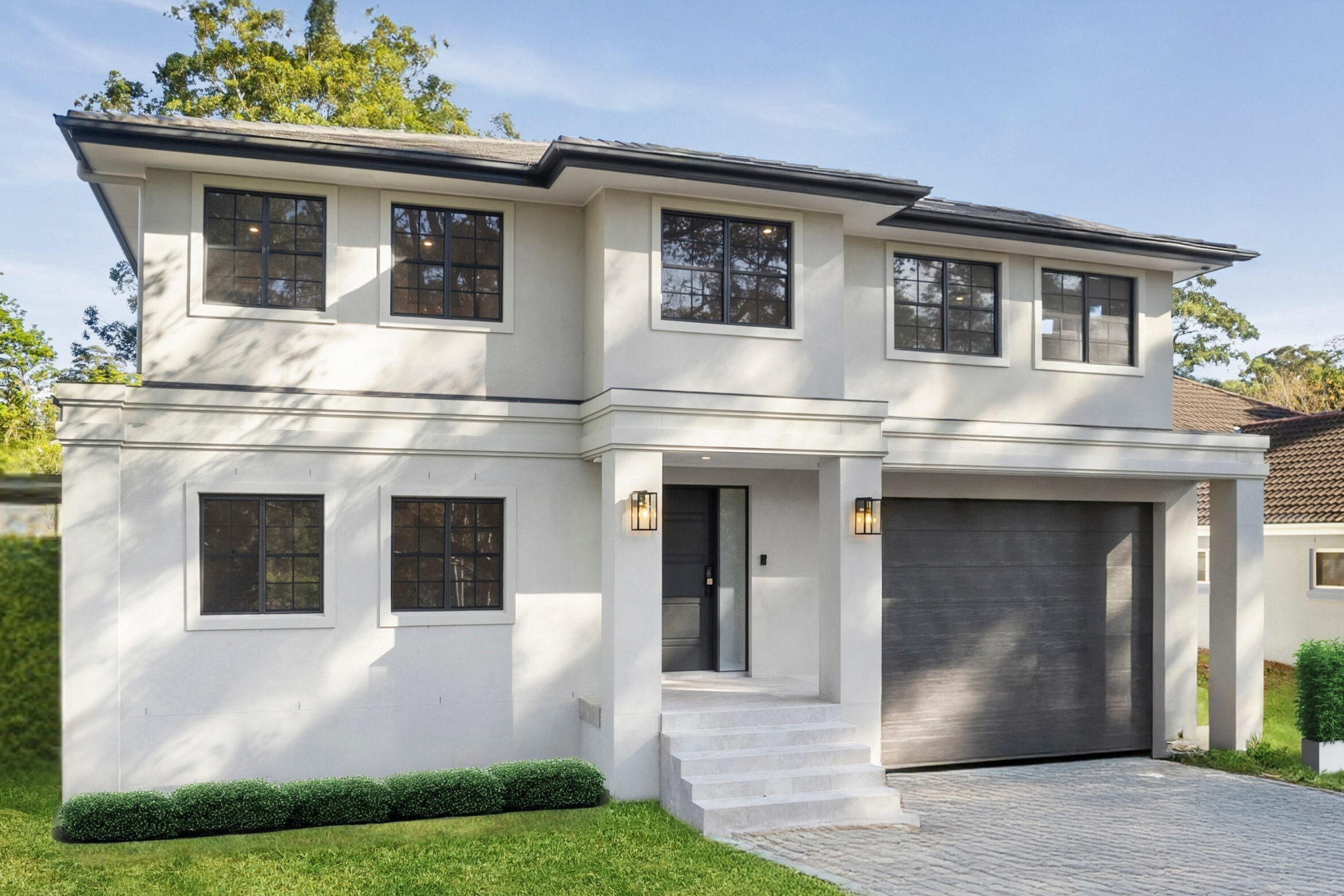 This residence is a contemporary interpretation of Provincial architecture, blending classical European proportions with clean, modern detailing to create a home that feels both timeless and unmistakably current. A symmetrical façade, rendered masonry, and a hipped roof establish a strong architectural foundation, while simplified mouldings, restrained ornamentation, and black-framed windows introduce a refined contemporary edge.