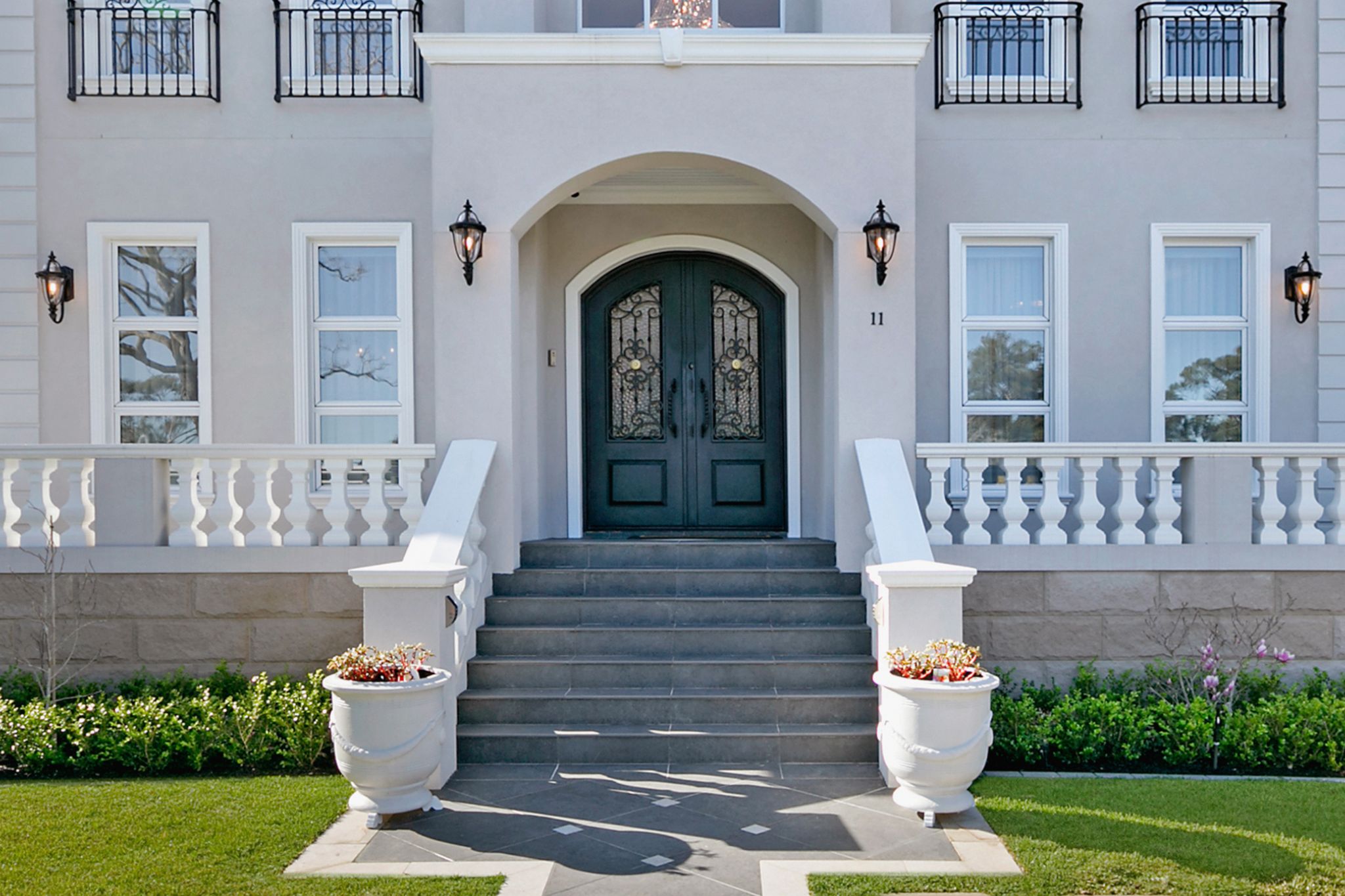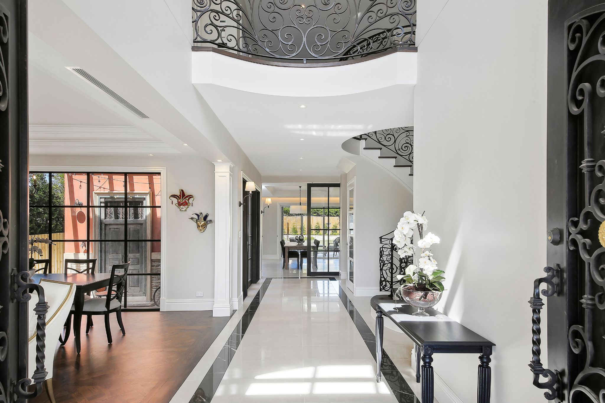 Inside, the home showcases signature French Provincial features including a sweeping curved staircase, wrought-iron balustrades, parquetry flooring, coffered ceilings and custom joinery. A gourmet kitchen with a handcrafted old-world rangehood anchors the heart of the home, supported by a full scullery and laundry for practical elegance.