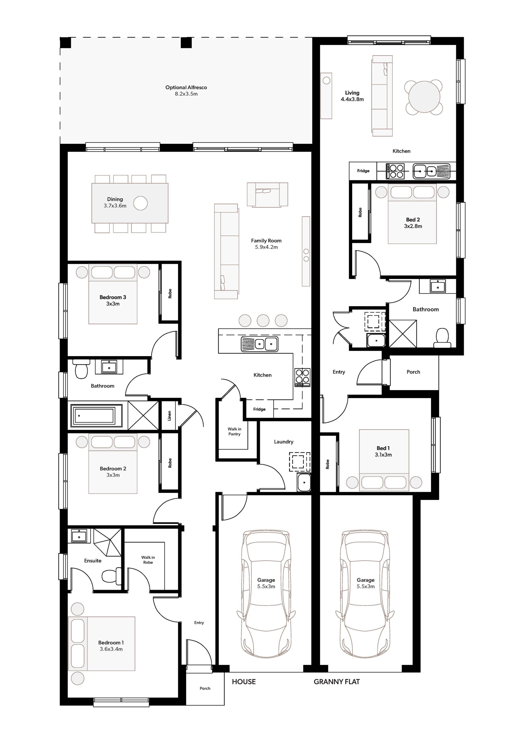 The Forster 25 presents as a residential home but is a cleverly designed dual dwelling. Ideal for property investors or families who want to stay close but not that close. The floor plan of this well thought out dwelling consists of a 3 bedroom, 2 bathroom, 1 car home on one side. And a 2 bedroom, 1 bathroom, 1 car home on the other. An ideal home that can adapt to suit your situation.