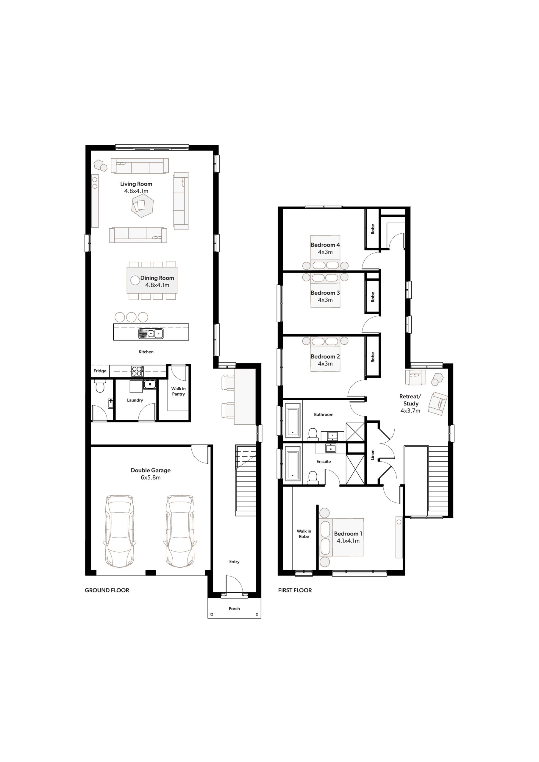 This narrow design does not compromise on luxury living. The compact layout includes all the features of a modern home with four bedrooms, open plan living, galley kitchen and a large island bench for your friends to gather around. There are two attractive living spaces perfect for study, teenage retreat or hobby area. With convenient internal access to a double garage, this homes reflects the life of a modern family.